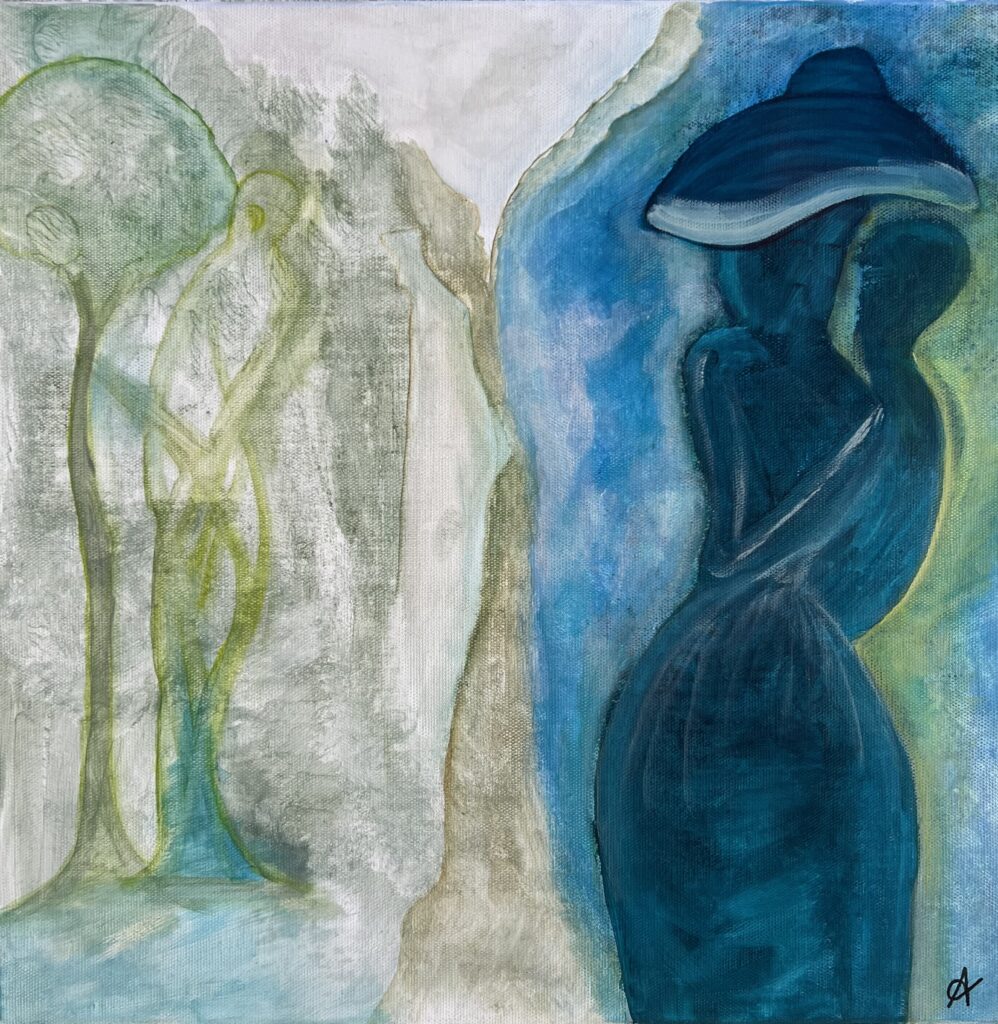 Les formes sont floues, les gestes amples, les couleurs organiques. Le bleu domine, comme un fil de survie.