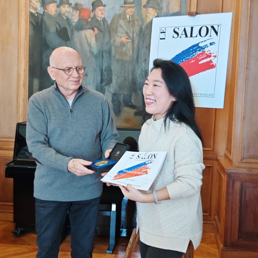 Le succès de Weber Zhang a été particulièrement remarquable : après avoir remporté le prix spécial en 2020, il a obtenu la médaille de Bronze au Salon des Artistes Français en 2024. Ces prix lui ont été remis lors d’une cérémonie prestigieuse à la Mairie du 5ème arrondissement de Paris, où Yaki Li, responsable de la galerie, a fièrement représenté l’artiste.
