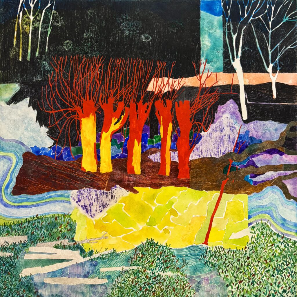 Wang Qi’s works are built in visual layers: vivid color fields, fine lines, graphic patterns, and areas of erasure. This composition creates a singular visual language, instantly recognizable. Her iconic flaming trees have become her signature—they embody memory, stability, and mystery.