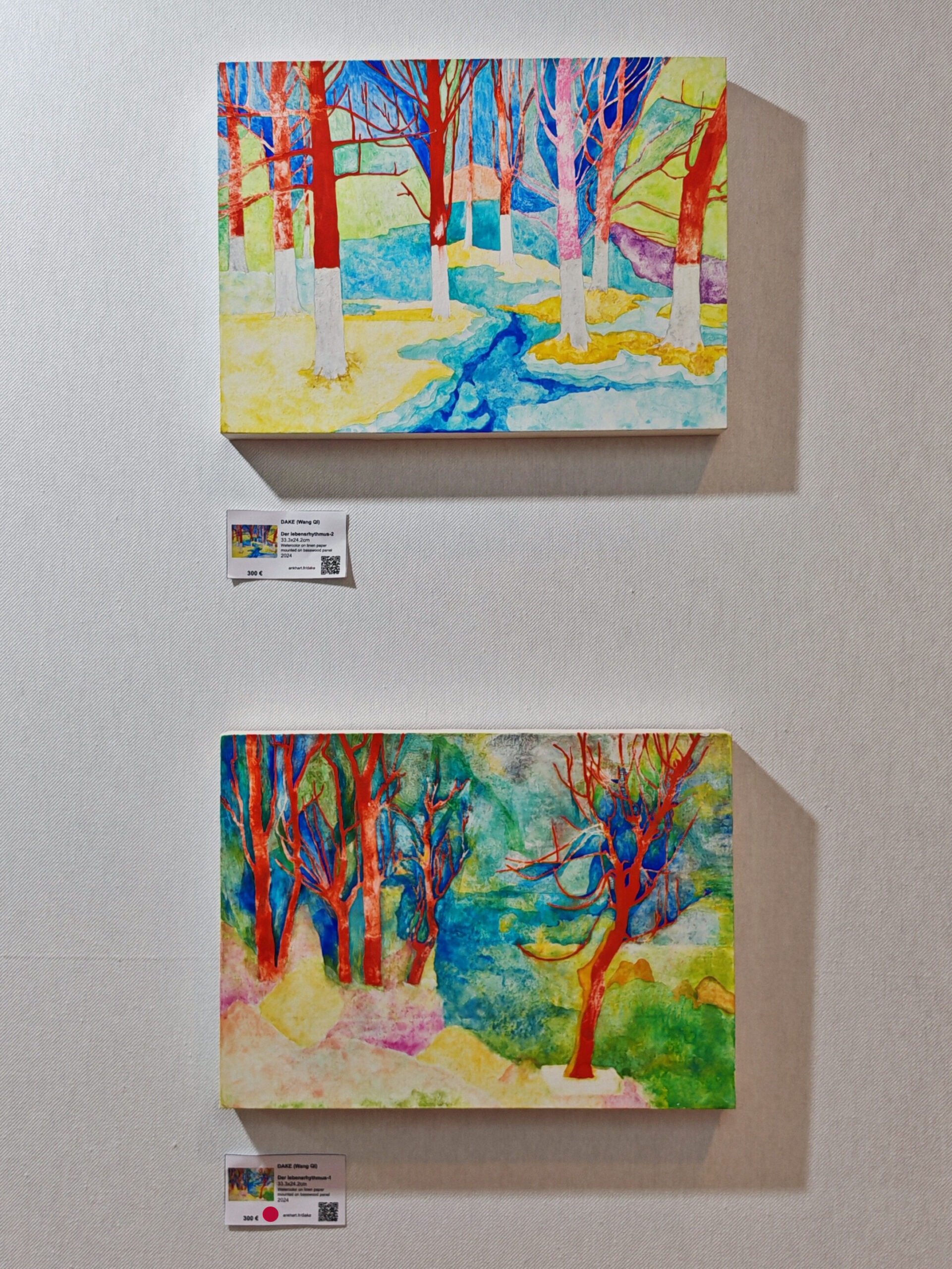 Far from traditional landscape painting, Wang Qi’s canvases offer a sensory experience. Red trees, green skies, turquoise grass—her vivid color palette reshapes our perception of reality. Each painting is an inner journey, a map of the imagination.