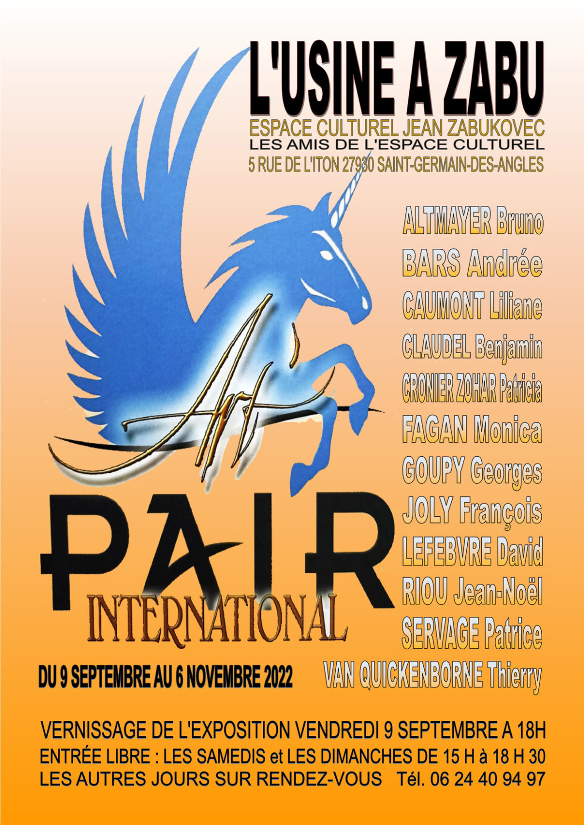 Du 9 septembre au 6 novembre , l’Usine à Zabu expose le collectif international de peintres et sculpteurs ART’PAIR INTERNATIONAL. 12 artistes exposeront leurs œuvres