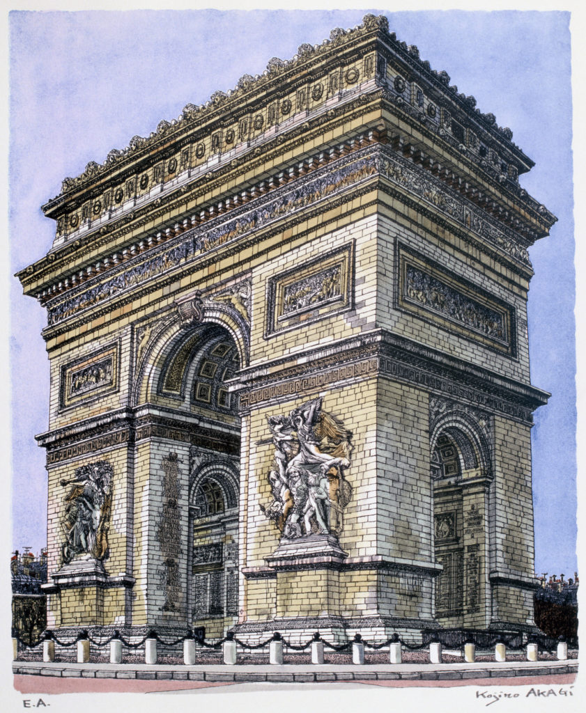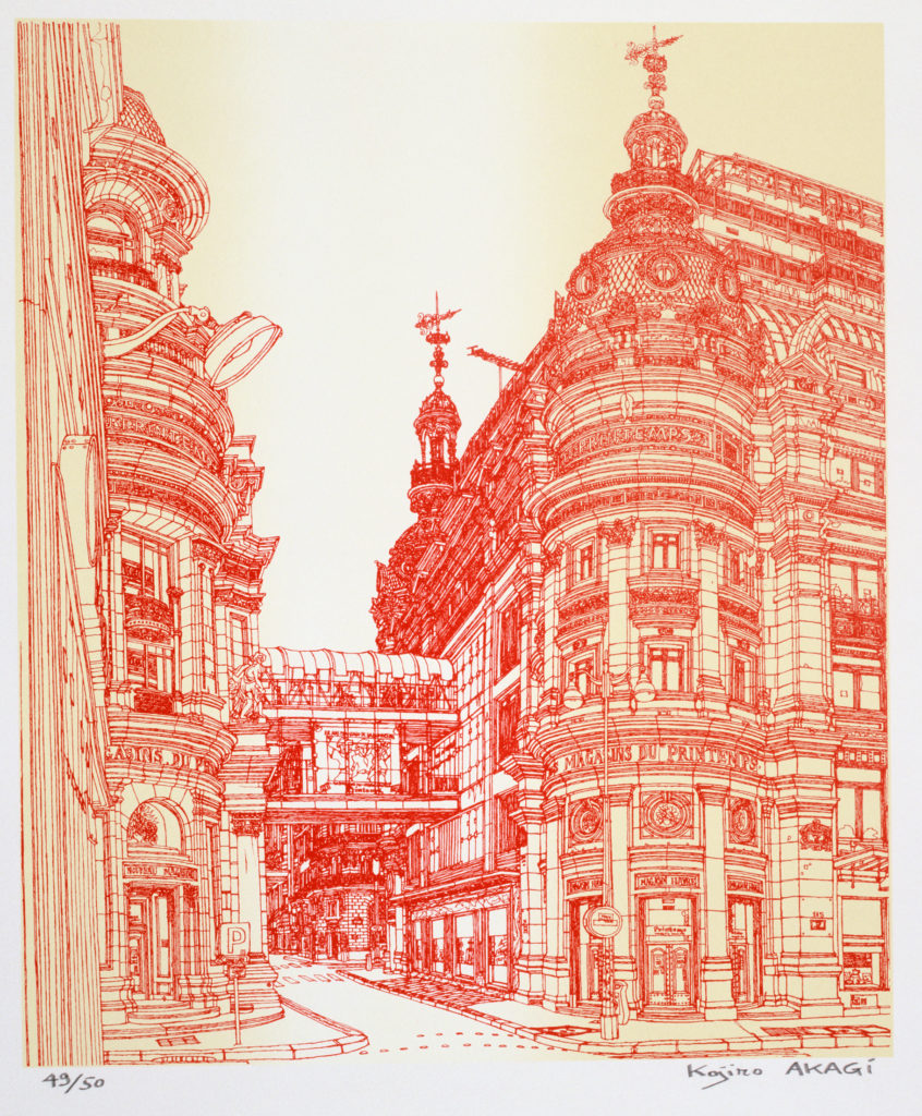 Ses vues de Paris présentent le charme caractéristique des ambiances parisiennes, de ses sites historiques, ses restaurants et grands magasins emblématiques ; Kojiro Akagi nous a laissé le témoignage de son regard attentif et singulier sur les lieux incontournables de la capitale.
