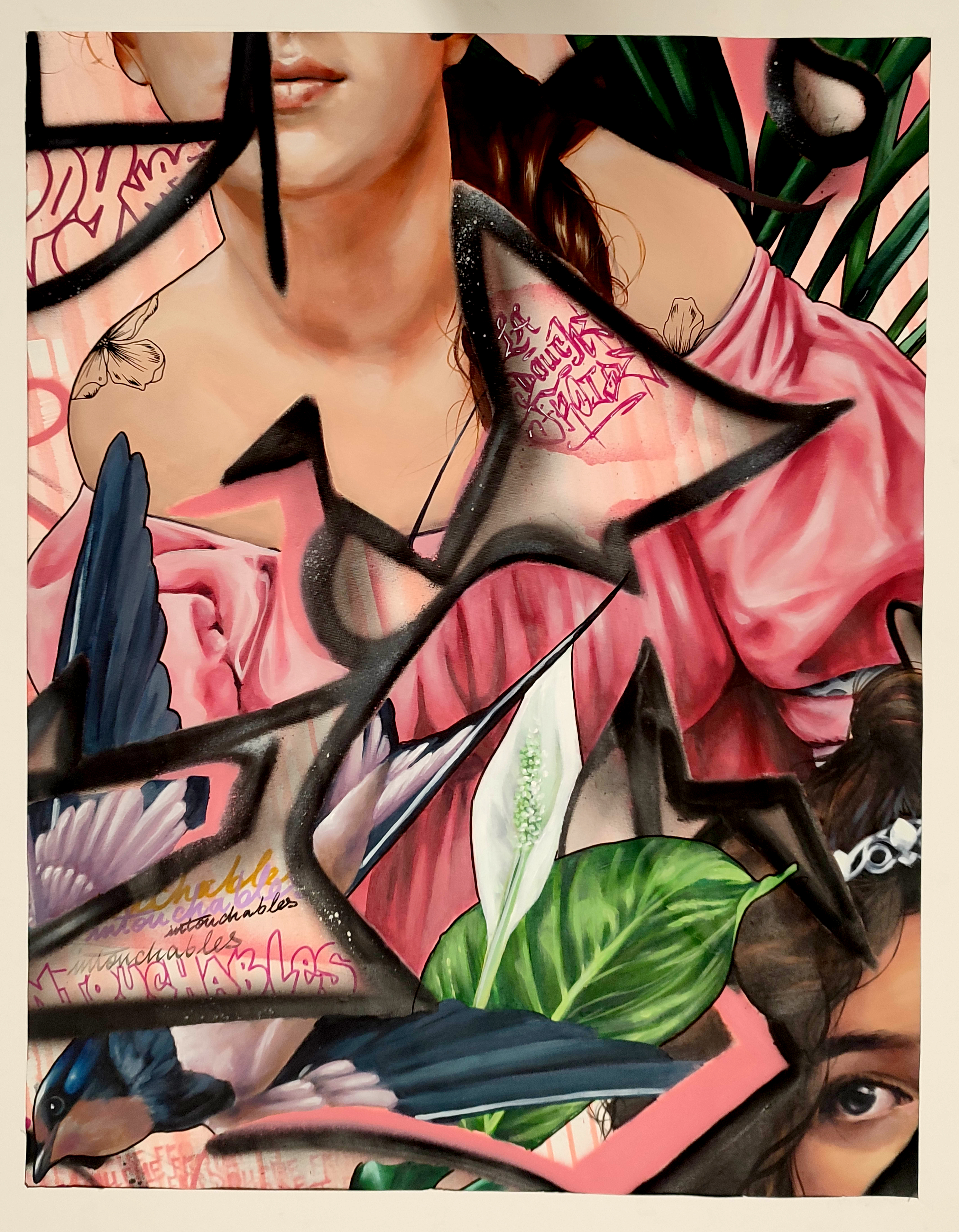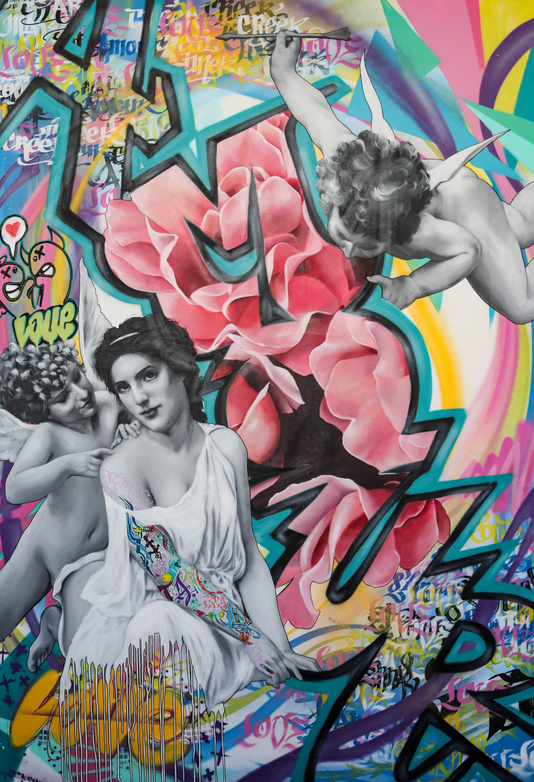 Le collectif La Douche Froide est une collaboration entre Elise Poinsenot, artiste peintre figurative et Mista Nove, graffeur. Œuvrant chacun dans le monde artistique depuis une vingtaine d’années, leurs chemins ont convergé sur des supports communs il y a 3 ans. Ils sont tous deux Francs- Comtois, Elise est née à Montbéliard en 1982 et Nove est né à Belfort en 1975. Leurs parcours restent atypiques mais surtout portés par la curiosité. Ce sont les ateliers d’artistes qu’Elise découvre à l’adolescence, et l’observation de son grand-père, aquarelliste, qui l’invite à réaliser un Bac littéraire artistique et plus tard à se diriger vers des études soutenues en Art thérapie (le M.A.T.). La flore est au cœur de sa pratique en réminiscence à ses études horticoles. Nove, quant à lui, voit débarquer le mouvement HIP HOP à Belfort en 1988, « Peace, love, unity » sont les maîtres mots de ce mouvement qu’il ne quittera plus et l’amène depuis ses 14 ans à peindre sur les murs, à faire partie de nombreux crew français, à apprendre de nouvelles techniques lors de JAM de graffiti et à rencontrer de nombreux artistes pour toujours affiner sa démarche.