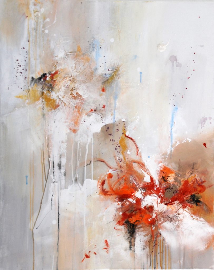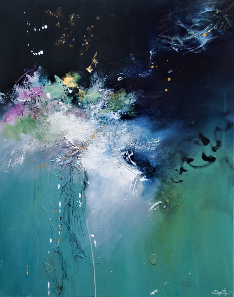 La rencontre avec une toile de Rogine Doré a changé sa vision de la peinture, sa passion pour l’abstraction est alors née. Roselyne a été percutée par une émotion intense. L’abstraction lyrique lui est alors apparue comme portée par le même élan, la même essence que la Vie : un espace de liberté sans fin, fait de doutes et de joies ; un espace pour accueillir tous les possibles et avancer seule sur ce chemin vers nul part, vers rien si ce n’est l’acte de peindre, l’acte de créer. L’abstraction s’est alors imposée comme une évidence, essentielle et indispensable, comme un souffle de vie.